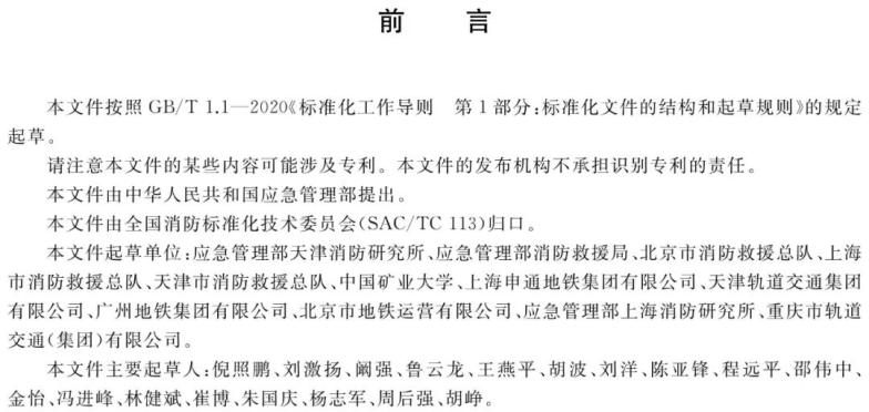 本文件起草单位:应急管理部天津消防硏究所、应急管理部消防救援局、北京市消防救援总队、上海市消防救援总队、天津市消防救援总队、中国矿业大学、上海申通地铁集团有限公司、天津轨道交通集团有限公司、广州地铁集团有限公司、北京市地铁运营有限公司、应急管理部上海消防研究所、重庆市轨道交通(集团)有限公司。