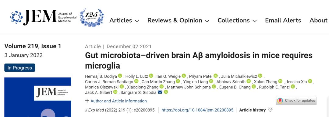 [1].Hemraj B. Dodiya, Holly L. Lutz, Ian Q. Weigle, Priyam Patel, Julia Michalkiewicz, Carlos J. Roman-Santiago, Can Martin Zhang, Yingxia Liang, Abhinav Srinath, Xulun Zhang, Jessica Xia, Monica Olszewski, Xiaoqiong Zhang, Matthew John Schipma, Eugene B. Chang, Rudolph E. Tanzi, Jack A. Gilbert, Sangram S. Sisodia; Gut microbiota–driven brain Aβ amyloidosis in mice requires microglia. J Exp Med 3 January 2022; 219 (1): e20200895. doi: https://doi.org/10.1084/jem.20200895