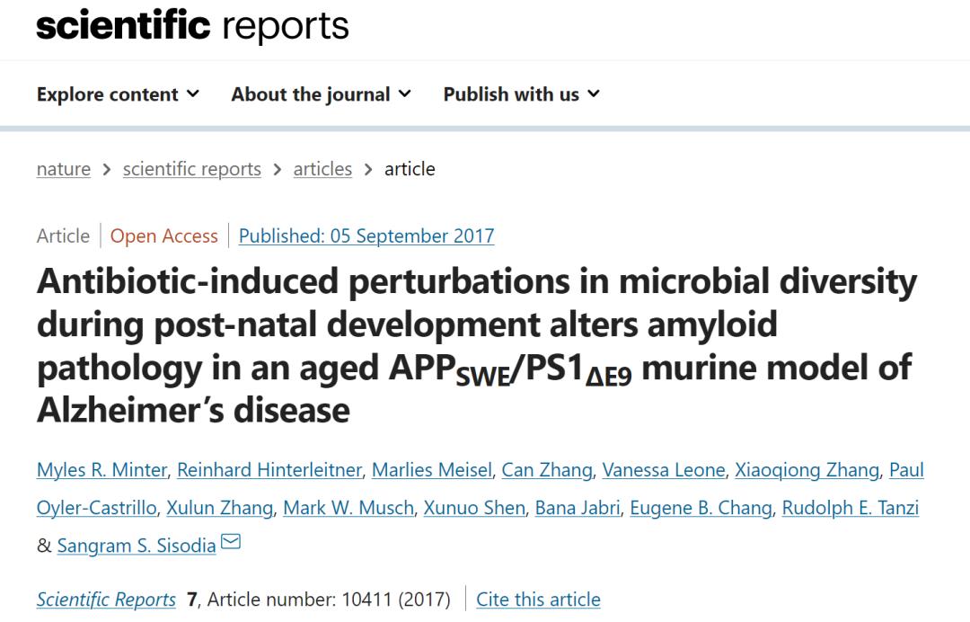 [2]. Minter, M.R., Hinterleitner, R., Meisel, M. et al. Antibiotic-induced perturbations in microbial diversity during post-natal development alters amyloid pathology in an aged APPSWE/PS1ΔE9 murine model of Alzheimer’s disease. Sci Rep 7, 10411 (2017). https://doi.org/10.1038/s41598-017-11047-w