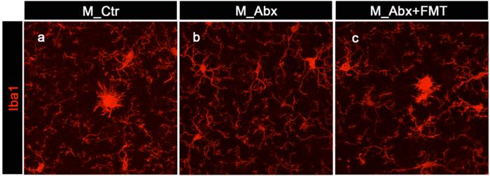 患有阿尔茨海默病的雄性小鼠大脑中的小胶质细胞具有“神经退行性”表征,并与大脑中的淀粉样斑块有关(左),而在生命早期用抗生素治疗小鼠可导致“神经保护性”的小胶质细胞,并减少淀粉样变性(中)。抗生素的有益效果可以通过简单的FMT逆转(右图)