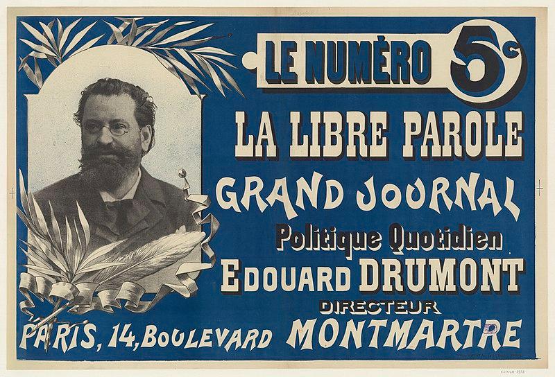 这一时期,法国出现了反犹报纸,比如《自由报》(La Libre Parole),其报头上的口号是“法国人的法国(France for the French)”,这仍然是法国右翼的最爱。这一运动一直持续到20世纪。它以与纳粹结盟的维希政府和法国参与对犹太人的驱逐和谋杀的围捕作为结束。