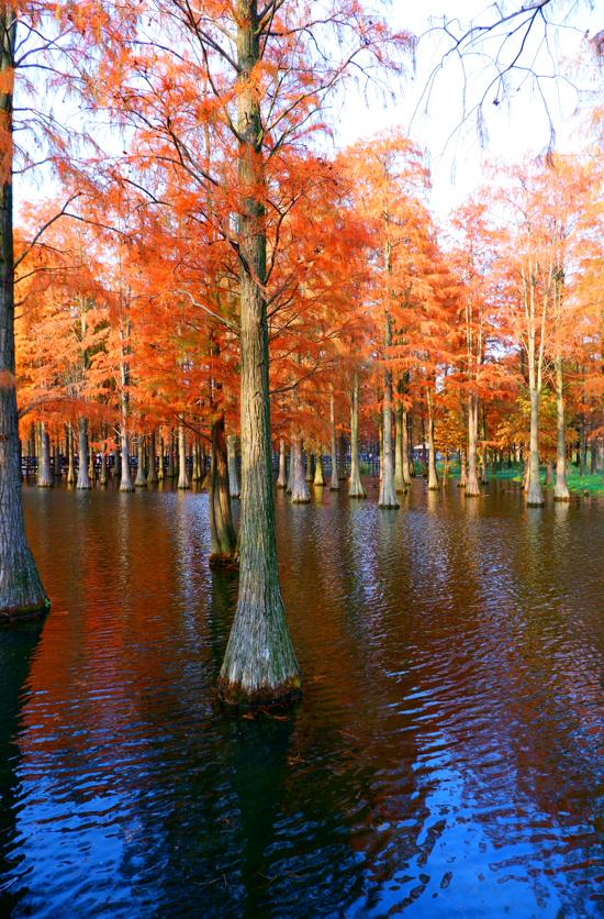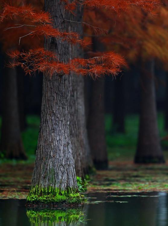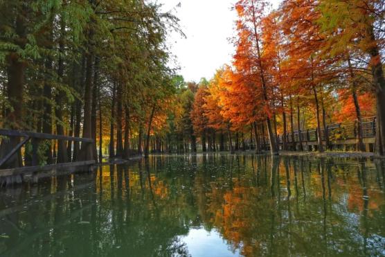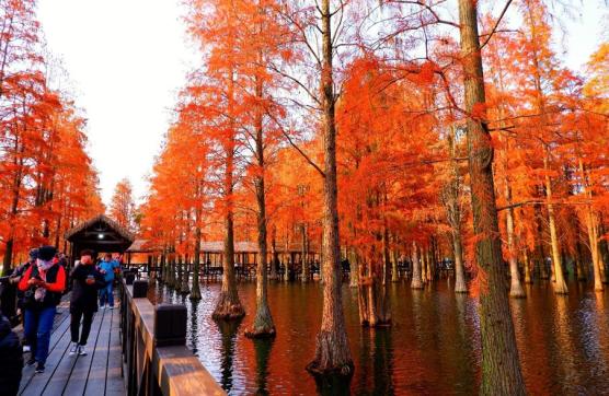 作为上海唯一的“水上森林”,这片占地83亩的树林现在已完全变红,远远看去,把湖面也映得通红。这份景致可维持到12月中旬,之后冬季羽叶将脱落,只能来年再来了。