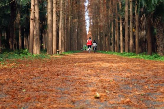 东平国家森林公园入冬后,水杉叶由绿色渐渐变金色,逐渐变成火红的颜色。推着一辆自行车漫步在公园的水杉林中,红杉成林、湖光荡漾、交相辉映,阳光打在杉林上,宛如大自然无意中打翻了调色盘,呈现出红、金、绿交织的绚丽色彩。公园今年还设了一条落叶景观道。