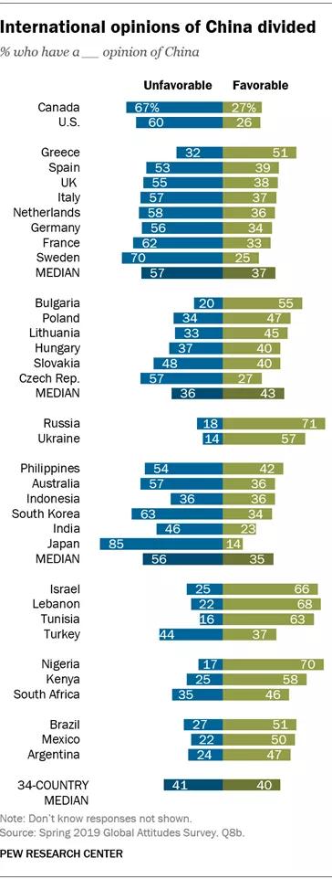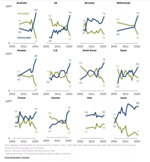 下图是美国皮尤研究中心(Pew Research Center)在 2020 年 10 月 5 日的调查报告,涵盖了12个发达国家,注意全球发展中国家民众对中国的好感度是明显高于发达国家的,这在不同的民意调查报告中是一致的。