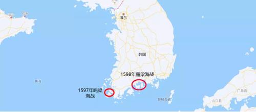 除了陆上的收复平壤战役,以及碧蹄馆之战等之外,海战方面有比较著名的1597年鸣梁海战和1598年露梁海战,这两场海战都是发生在韩国境内,如下图所示。