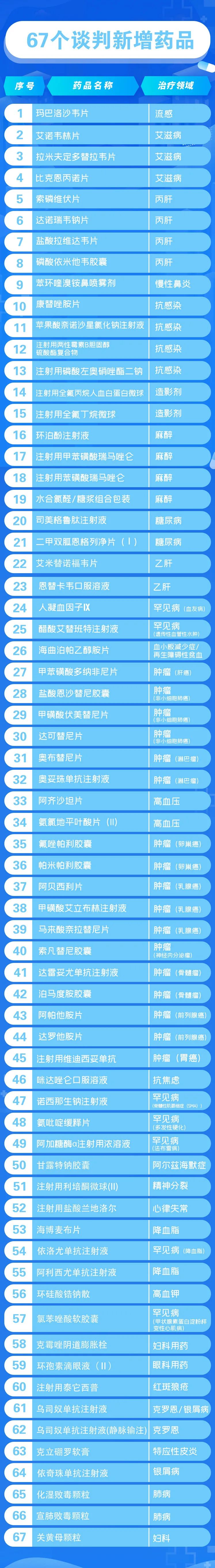 67个谈判新增药品覆盖艾滋病、丙肝、慢性鼻炎、抗感染、造影剂、麻醉、糖尿病、乙肝、罕见病(血友病、遗传性血管性水肿、髓性肌萎缩症等)、肿瘤、高血压、抗焦虑、阿尔茨海默症、精神分裂、心律失常、妇科用药、眼科用药、银屑病、肺病等疾病领域。