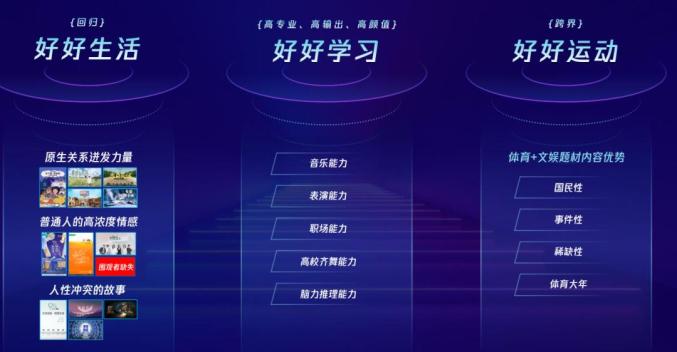 拿腾讯视频最新发布的综艺内容来说,平台就划了三条主要赛道,好好生活、好好学习、好好运动。
