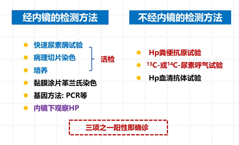 HP粪便抗原试验、呼气试验或内镜活检中三项有一项阳性,则提示有HP感染。接下来我们来一个介绍这些方法的不同之处。