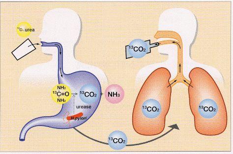 13C标记的尿素在尿素酶作用下,分解成13CO2,13CO2从胃肠道吸收经血液循环到达肺随呼气排出。收集呼出的气体,测定其中的12CO2和 13CO2,并与本底比较,就可间接判断有无HP感染。正常人没有HP,13C-尿素不分解,13C-尿素经泌尿系统排出,呼出的气体中就没有13CO2。