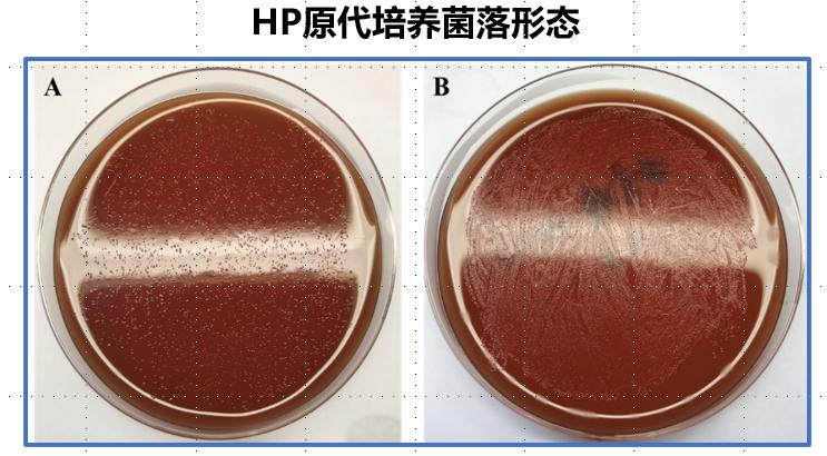 胃窦部取一块胃黏膜组织立即用无菌牙签插入快速尿素酶试剂板,贴上贴纸,室温下数分钟内试剂颜色由浅黄色变为粉红色,则认为此胃黏膜幽门螺杆菌阳性,否则为阴性。取下的胃粘膜在培养皿上进行培养,查看菌落形态:幽门螺杆菌菌落在菌落较少时,肉眼下呈半透明、针尖样大小的圆形扁平菌落(图A),当菌量较大时,可形成油亮样半透明的菌苔(图B)。