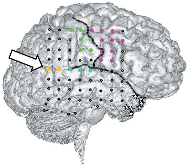 箭头指示的黄色区域,就是研究中电刺激的脑区 | 图源:Blanke O, et al. 2002.自我意识与错觉