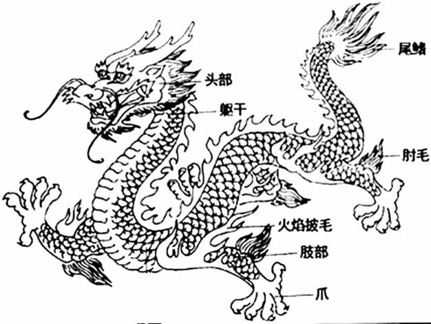 汉代 “伏羲女娲双龙”画像砖汉以后的龙形象逐渐凸显出其“集合了多种动物”而来的文化形象。古语有云:“龙有九似”,即:角似鹿、头似驼(马)、眼似兔(龟)、项似蛇、腹似蜃、鳞似鱼、爪似鹰、掌似虎、耳似牛。其实,龙的取材对象远远不止这9种,鳄、蜥蜴、猪、马、熊、鲵、象、狗、羊、蚕、鸟类,以及云雾、雷电、虹霓、龙卷风、古动物化石等等,都不同程度地参与了龙的融合。