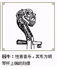囚牛,是龙生九子中的老大,平生爱好音乐,它常常蹲在琴头上欣赏弹拨弦拉的音乐,因此琴头上便刻上它的遗像。