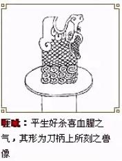 睚眦,是老二,平生好斗喜杀,刀环、刀柄、龙吞口便是它的遗像。