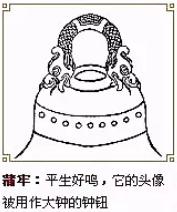 蒲牢,形似盘曲的龙,排行第四,平生好鸣好吼,洪钟上的龙形兽钮是它的遗像。