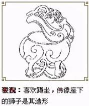 烟火渺袅显威严相传这种佛座上装饰的狻猊是随着佛教在汉代由印度人传入中国的,至南北朝时期,我国的佛教艺术上已普遍使用,这种造型经过我国民间艺人的创造,使其具有中国的传统气派,后来成了龙子的老五,它布置的地方多是在结跏趺坐或交脚而坐的佛菩萨像前。明清之际的石狮或铜狮颈下项圈中间的龙形装饰物也是狻猊的形象,它使守卫大门的中国传统门狮更为睁崃威武。