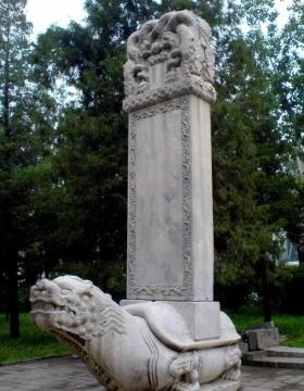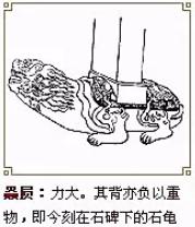 霸下,又名赑屃(bì xì),形似龟,是老六,平生好负重,力大无穷,碑座下的龟趺是其遗像。传说霸下上古时代常驮着三山五岳,在江河湖海里兴风作浪。后来大禹治水时收服了它,它服从大禹的指挥,推山挖沟,疏遍河道,为治水作出了贡献。洪水治服了,大禹担心霸下又到处撒野,便搬来顶天立地的特大石碑,上面刻上霸下治水的功迹,叫霸下驮着,沉重的石碑压得它不能随便行走。