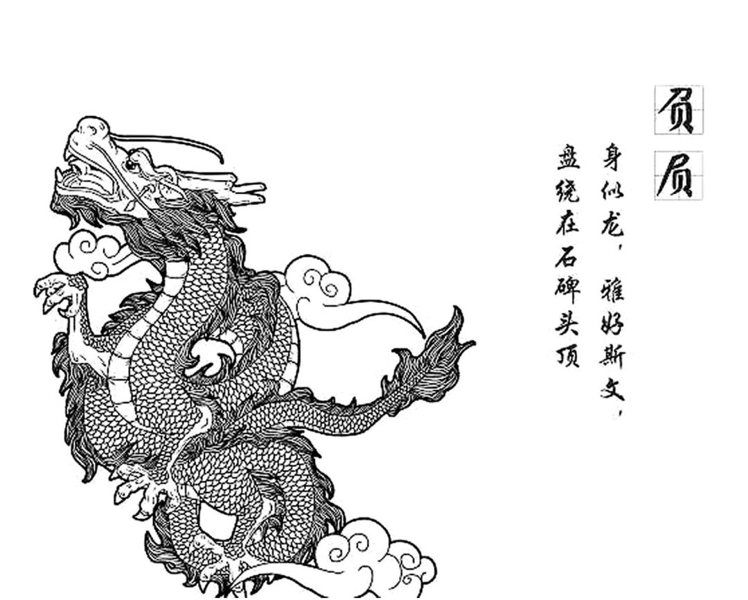 负屃,似龙形,排行老八,平生好文,石碑两旁的文龙是其遗像。