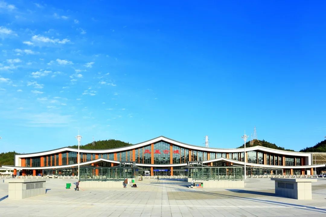 凤凰古城站,将凤凰起伏的群山、沱江边的吊脚楼、延绵的坡屋面等元素相结合,营造别有特色的建筑风格。车站候车厅整体深化构思以“灵秀山水 凤舞湘西”为主题。通过对山水、凤凰纹饰、传统民居建筑元素的提取、简化、运用,体现文化性和地方特色。