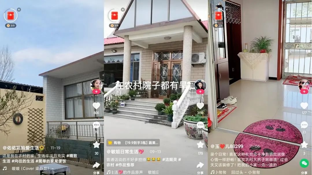 在快手和抖音中农村别墅住宅也是热门内容,乡土之上的人们既有着独特的乡村生活,也体验着现代都市生活。也由此为设计农村别墅的商家提供了契机,农村逐渐成为装修设计、家居用品的重要市场,