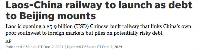 赶在铁路正式开通运营之前,美联社(AP)在一篇报道中称,这条铁路将外国市场同中国西南贫困地区相连接,却让老挝面临着“堆积如山的债务风险”;除了炒作“债务违约”的问题,法新社(AFP)还将中老铁路比作“白象”(White elephant),指其可能成为“投资庞大却没有作用的基础设施”,对“长期可行性”表达担忧;甚至还有美媒声称这将使老挝在经济上越来越依赖中国,使老挝完全被中国经济政治所绑定。