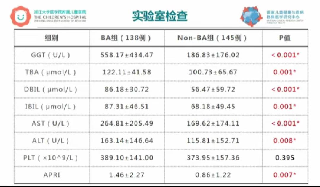 对于实验室检查结果的解读,钭教授对比了胆道闭锁患儿与非胆道闭锁患儿各项指标的数据差异以及其统计学意义。