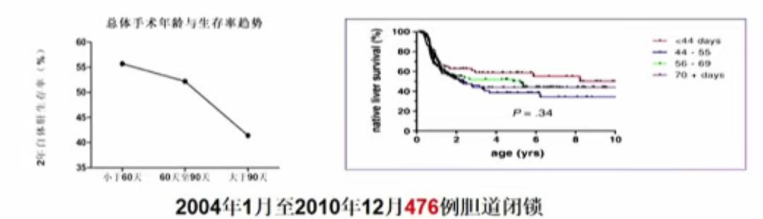 钭教授列举了2004年1月~2010年12月探索胆道闭锁手术年龄和生存率的回顾性研究结果。