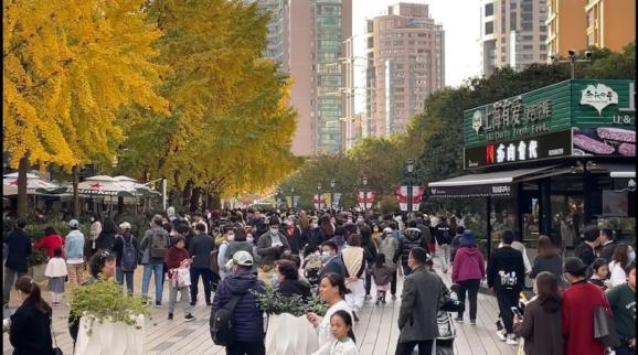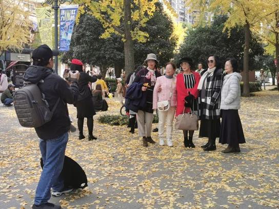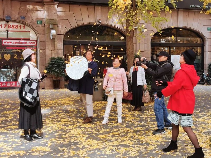 从前滩太古里到古北黄金城道,金秋时节的上海网红打卡点,都出现过这样的摄影队:一群靓丽阿姨,标配一个“工具人”爷叔。