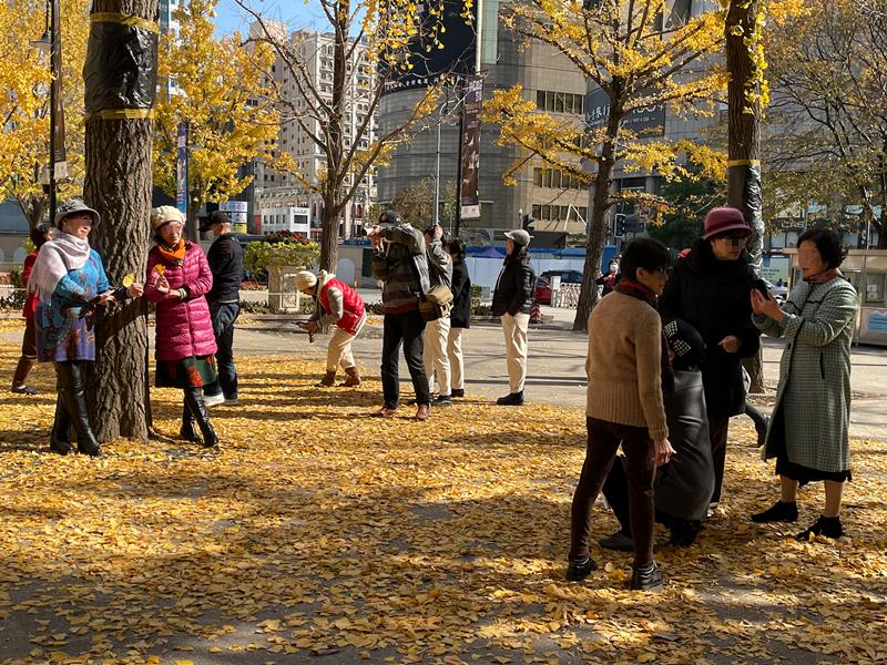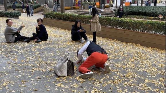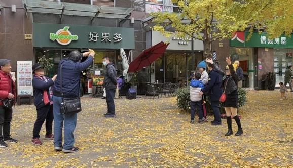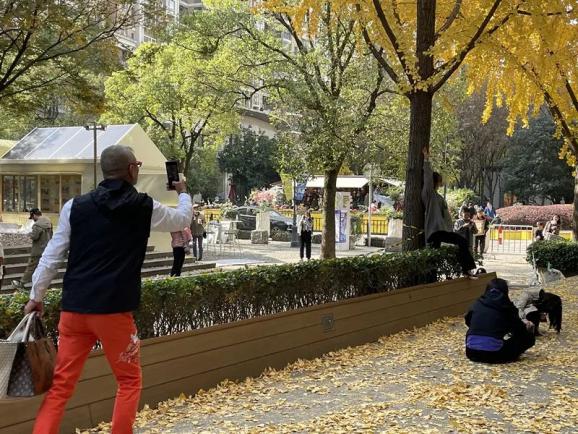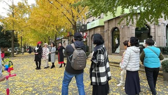 重复走了四五次T台猫步后,其中一位阿姨叫刘国栋也站到银杏树下,去拍一张留影。于是他马上化身“被拍工具人”。