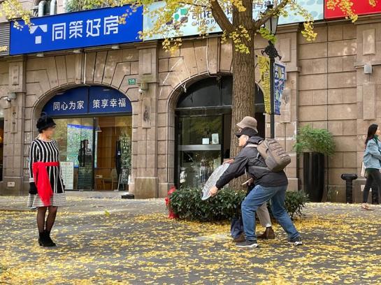 同时指导一旁standby(待命)的阿姨怎么抛落叶,丰富照片的构图,“扔叶子的高度不对,侬没掌握风向”。