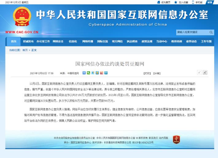 12月1日,国内社区平台豆瓣网主要负责人、总编辑被约谈,同时,企业被罚款150万元。