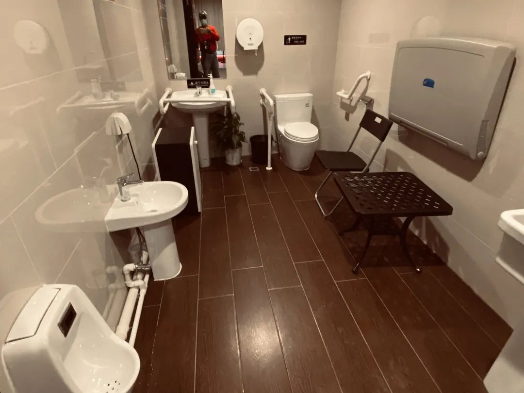 无障碍厕间内,配备了带安全抓杆的坐便器及隔间厕位。
