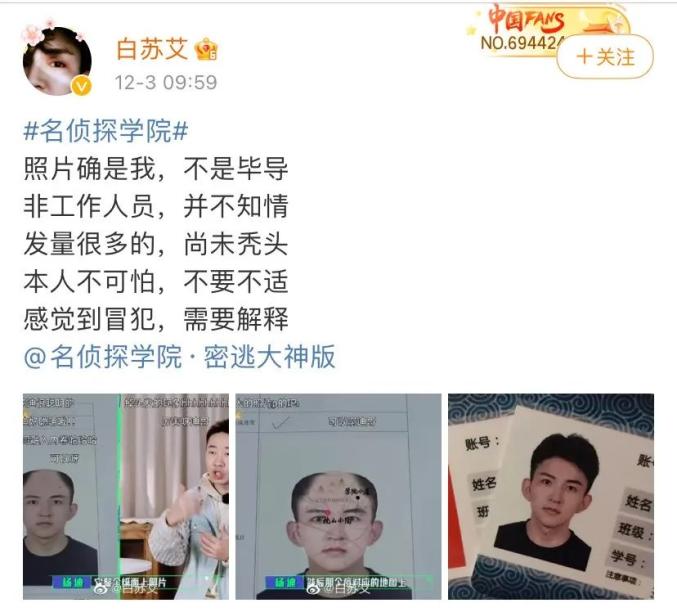 12月3日上午,网友@白苏艾 发文称,芒果TV《名侦探学院第五季》综艺节目在其不知情的情况下,公开使用了其照片,并将其P成了秃头,对此他感到被冒犯。
