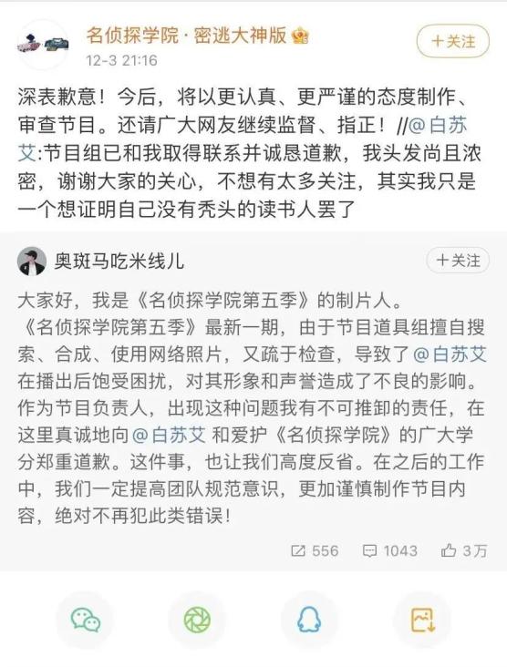 12月3日晚上,网友@白苏艾 在微博回复称,“节目组已和我取得联系并诚恳道歉,我头发尚且浓密,谢谢大家的关心,不想有太多关注,其实我只是一个想证明自己没有秃头的读书人罢了。”