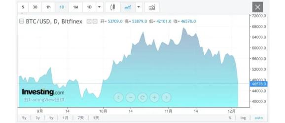 此前比特币价格在今年11月创下历史新高,突破至69000美元,加密货币总体市值攀升至3万亿美元附近。但冲击70000美元关口失败后,比特币价格走势明显乏力。12月1日比特币最高价格曾触及59000美元,此后便一路下跌。