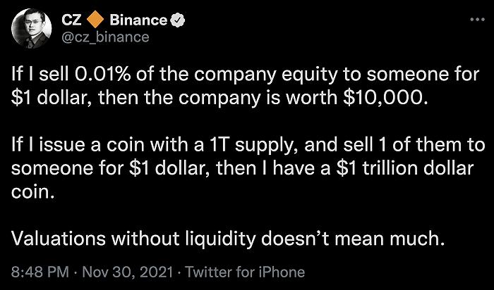 不过,11月30日,赵长鹏在社交媒体发布信息称,如果将公司权益的0.01%以1美元卖出,是否公司就值1万美元;如果发行1万亿总量的货币,并以1美元售出一个代币,是否他就有1万亿美元价值的币。并在其后评论,没有流动性的估值不意味什么。疑似回应有关登顶华人新首富身价900亿美元的热搜。