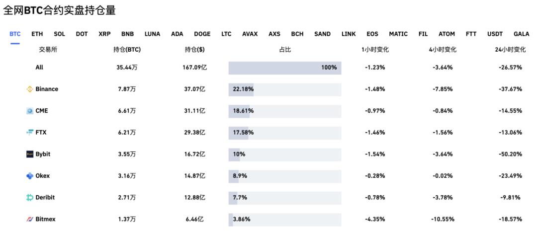 根据Coinglass网站数据,从比特币持仓量来看,截至4日晚9点区块链交易平台币安(Binance)的比特币合约持仓占比达到了22.18%,在各平台中排名第一。