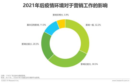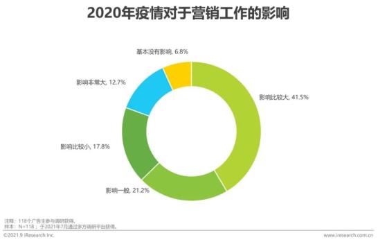 根据艾瑞广告主调研显示,超五成广告认为2020年疫情对营销工作有较大或非常大的影响。而伴随疫情影响趋缓、日常防控常态化、居民防疫意识的提升,疫情对于社会生活的影响正在逐渐减弱。进入2021年后疫情时代,认为疫情环境对影响工作仍有较大或非常大影响的广告主比例下降了15%左右,而认为基本没有影响或影响比较小的广告主比例增长到30%左右。这也反映出尽管抗疫工作仍未结束,但大部分广告主认为后疫情环境在营销工作开展过程中不再是核心考量因素,对于营销环境表现出积极、充满信心的态度。