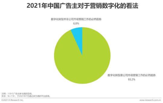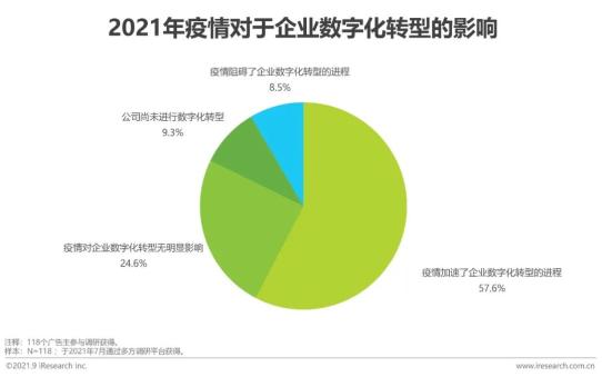 社会数字化转型也推动着企业数字化升级以及营销工作的数字化变革,而疫情则催化了这一进程。在疫情爆发之后,近六成的广告主认为“疫情加速了企业数字化转型的进程”,在疫情环境下,远距离办公对很多企业来说从一个“可选项”变成“必要选项”,各类流程的审批、会议的召开等工作都在疫情后越来越多的走向线上平台,也提升了公司业务流程和营销工作的数字化渗透率。在关于数字化与营销关系的调查中,超过九成的广告主认为“数字化转型是公司市场营销工作的必然趋势”,较上年67.0%的广告主认为数字化升级非常有必要的数据有明显提升,一方面因为营销作为企业重要的业务场景,顺应了企业数字化的大趋势,另一方面则是因为营销技术的加速升级和渗透,在不同板块和场景的应用不断普及,使得广告主对于营销工作数字化的信心也不断增强。