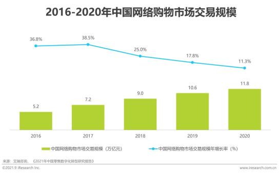 疫情期间,线下消费渠道和场景严重受限,消费群体更进一步向线上平台倾斜。2020年中国社会消费品零售总额出现了近20年来的首次下降,降幅为3.9%,但相比社会消费品零售总额的负增长趋势,网络购物市场仍保持积极态势,在2020年达到11万亿元,占总体零售市场的比例进一步扩大。而在疫情之后,用户的线上消费习惯得到加强,同时境外病例的输入以及各地零星的确诊案例仍一定程度的影响着消费者线下消费的意愿。消费者对于线上消费渠道的深度倚靠一方面带来了最直观的营收增长,另一方面也使得消费者关键数据在电商平台的集中与沉淀,电商平台的营销价值得到进一步放大。
