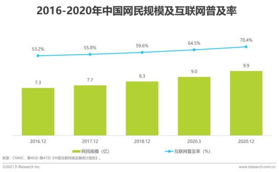 截至2020年底,我国网民规模达到9.89亿,互联网普及率突破七成。近十亿的网民规模构成了全球最大数字社会,并且网民规模增长的主体由青年群体向未成年和老年群体扩散,未成年人、银发族与传统的网络主力军青年群体,共同构成了我国多元庞大的数字社会。新冠疫情加速了社会的数字化转型进程,疫情的隔离和线下场所的封闭使用户更倾向于互联网,用户的上网意愿增强,上网习惯得以巩固。用户利用流媒体和社交平台获取和发布信息,借助网络购物、网上外卖解决生活所需,通过在线政务应用和健康码办事出行,共享互联网带来的数字红利。这些变化一方面使得人们的消费行为向线上平台的再度倾斜,另一方面也使得线上平台的价值向全年龄层蔓延,不再聚焦于单一的年龄群体,Z世代、银发族等群体成为消费市场尚待深挖的潜力人群。