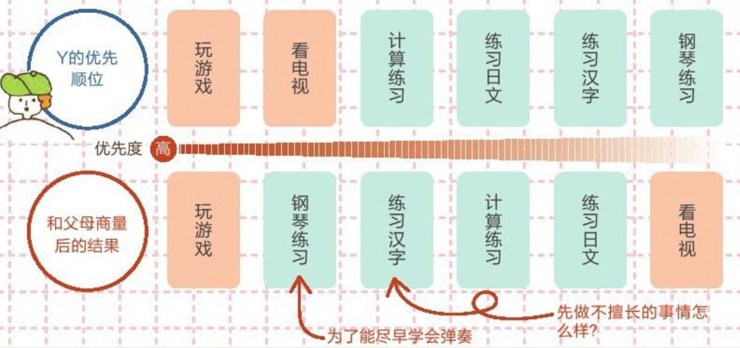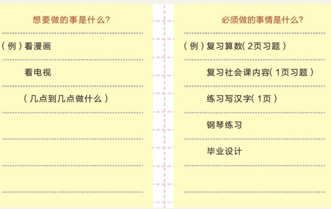 父母要引导孩子思考一下,什么是“必须做的”,什么是“想要做的”,然后让孩子把这两项分别列出来。