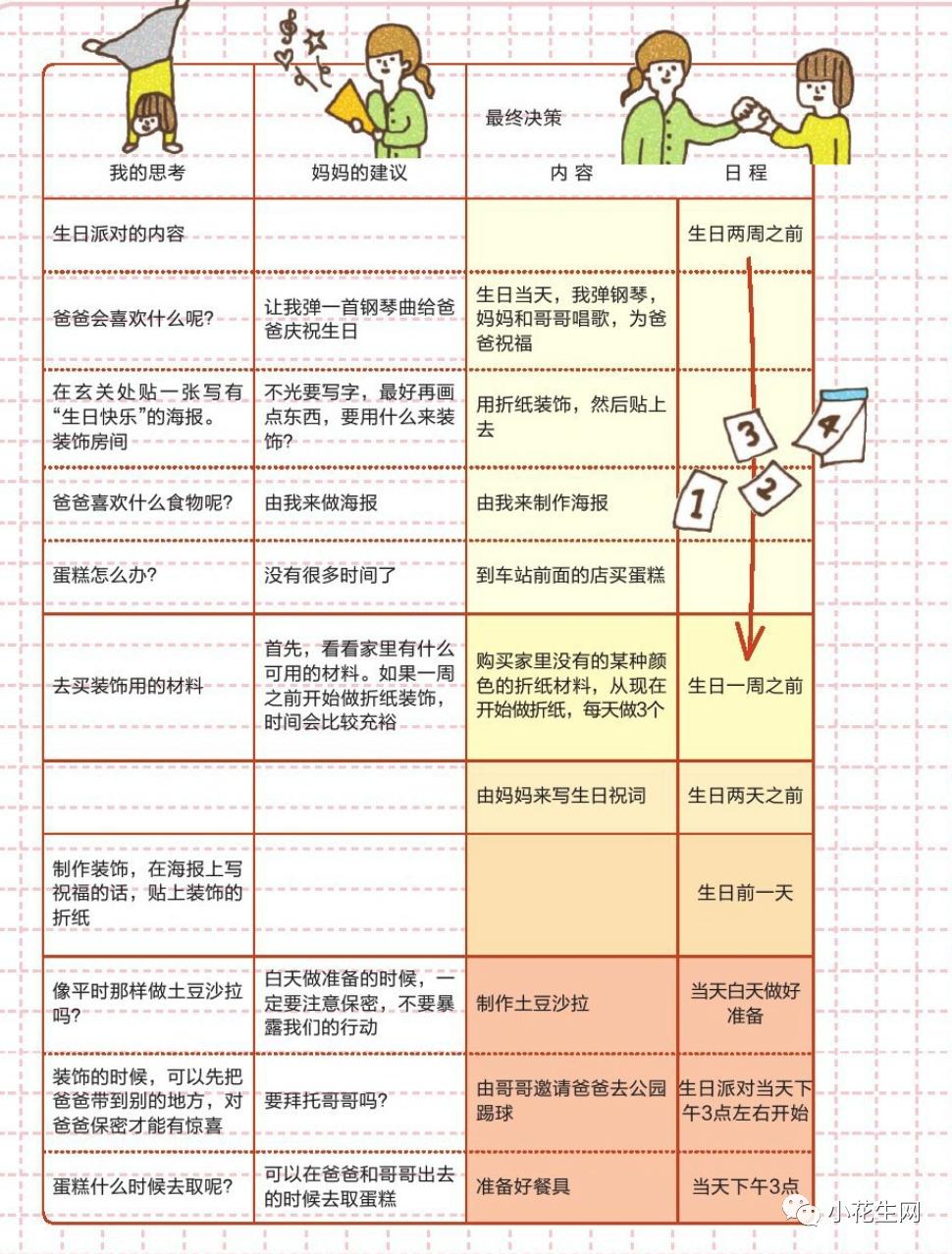 还可以通过带孩子策划一次欢乐家庭活动来实战,比如要给爸爸筹备一次生日惊喜,该做什么准备呢?该怎么定时间计划呢