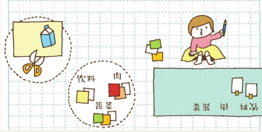我们常会从外边拿回来各种各样的宣传单。可以把上边的商品剪下来,按照面包、饮料、蔬菜,或者是服装、鞋、家电这样的分组进行分类,再贴到纸板上。