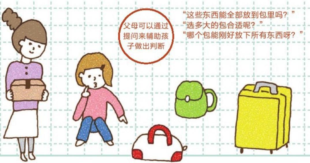 可以通过让孩子为旅行做准备,来培养孩子的空间感:要用多少东西,要把这些东西放到多大的包里。