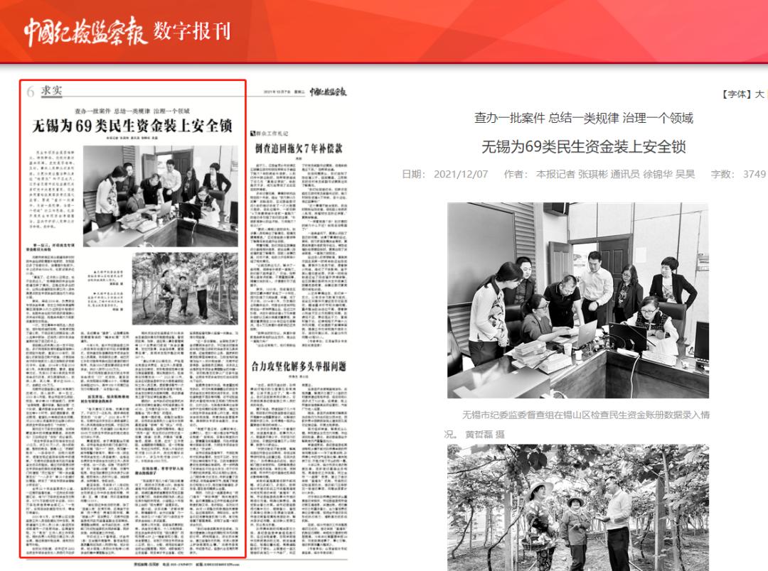 2021年12月7日,《中国纪检监察报》刊发了无锡市纪委监委题为《无锡为69类民生资金装上安全锁》的文章。