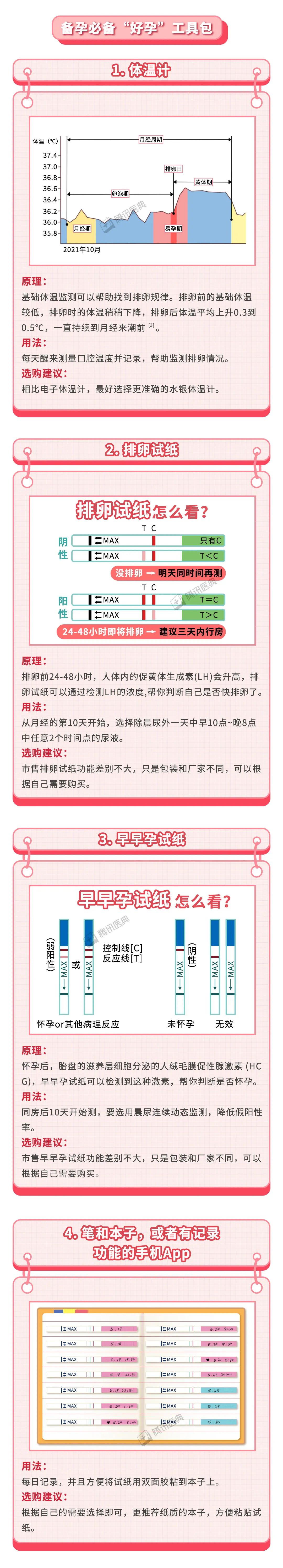 4.排除了感染及本身发热情况下,如果早晨基础体温上升0.3-0.5℃,则提示排卵。排卵试纸强阳性后36小时左右,提示排卵。根据这两个方法计算好时间,适度同房。