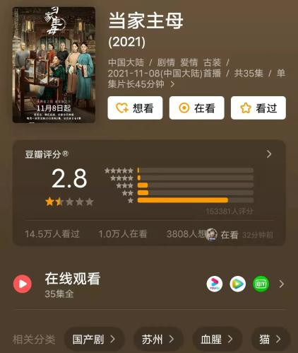 前段时间,《当家主母》陷入疑似“虐猫”的争议中,但剧组并没有及时给到拍摄时的花絮素材,等到争议愈演愈烈之后发出了白猫与主人的视频,并送上了“一纸声明”。迟到的声明以及尚不足以验证是同一只白猫的证明,瞬间点燃了诸多爱猫人士的怒火,纷纷涌入豆瓣打一星,截至当前,《当家主母》评分已从开分的5.2降至2.8,一星占比高达78.5%,“猫”、“血腥”成了这部剧的关联词。