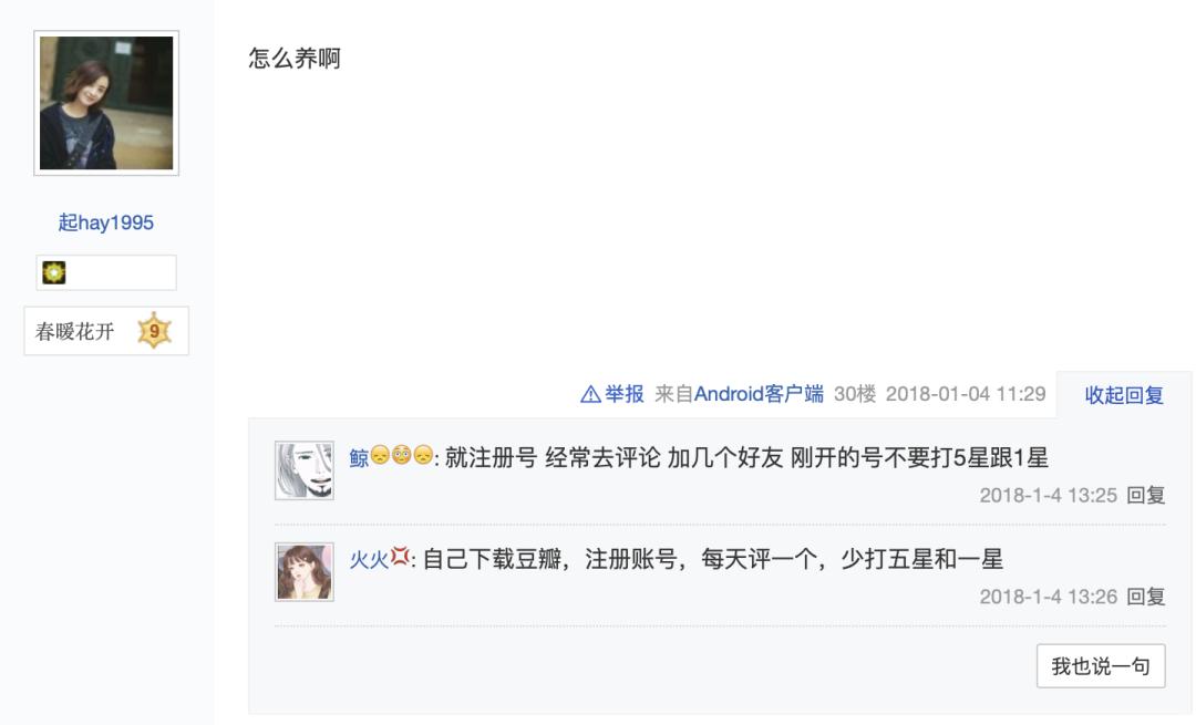 查询到饭圈流行“养号”的最早时间,大约是在2018年初,有粉丝在贴吧中强调豆瓣养号的重要性,这则帖子下方,也有粉丝总结出了养号的注意事项:尽量用手机号注册,注册后多加小组,多活跃,尽量多给老片打分,写评论,不要单纯复制粘贴,可以百度影评,尽量不要给首页的新片打分,这样比较假,可以多给老片打分,这样可以增加权重,刚开的号不要打五星或者一星,多打三星和四星等等。