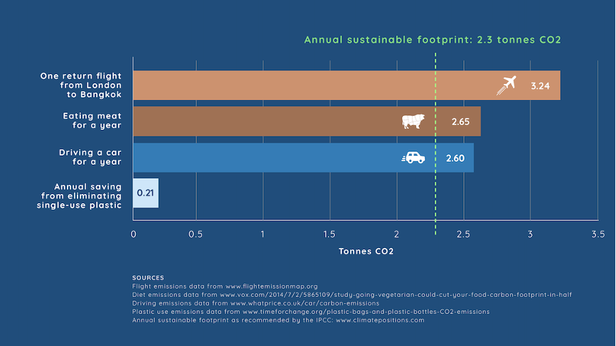 飞行碳排放与其他活动对比,自上而下:从伦敦到曼谷往返航班的碳排放;全年吃肉的碳排放;全年驾驶私家车的碳排放;一年不用一次性塑料包装减少的碳排放。碳排放量单位为“吨二氧化碳”
